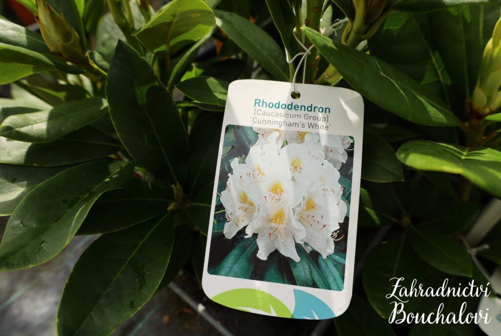 Rododendron ‘Cunningham’s White’ je stálezelený keř kompaktního tvaru. Má velké, bílé květy s žluto-oranžovým tečkováním na hrdle květů. Pěstuje se v kyselé půdě. Preferuje rozptýlené světlo nebo polostín. Dorůstá do výšky zhruba 150 až 200 cm.